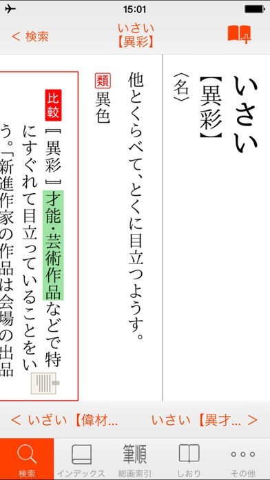 「インクリメンタルサーチ」機能により、うろ覚えの単語でも文字を入力するごとに候補を絞ってくれます。検索結果には単語の意味がダイジェストで表示されるので、調べたい言葉にすぐにアクセスできます。