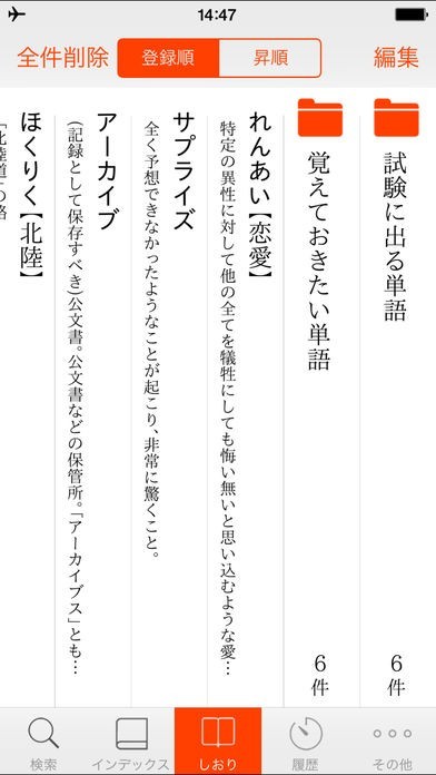 調べた言葉の語釈の中でさらに調べたい言葉があれば、タップするだけですぐに検索することができます。タップサーチで次から次へとスピーディーに言葉を検索していけます。