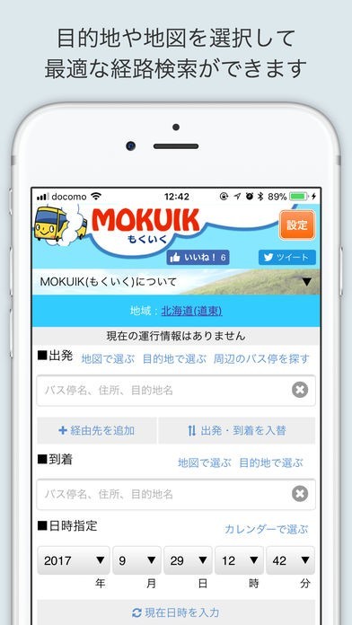 もくいくは、バス停名や住所、目的地などから路線バスの検索ができる