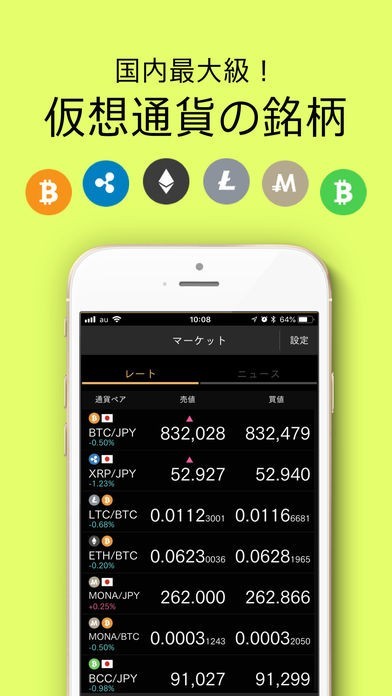 ビットコインはもちろんライトコインやモナコインなど、国内最大級の仮想通貨6種類8通貨ペアの取引が可能です。各銘柄の取引値は一覧で表示しているので、買い時売り時のタイミングがすぐに分かります。