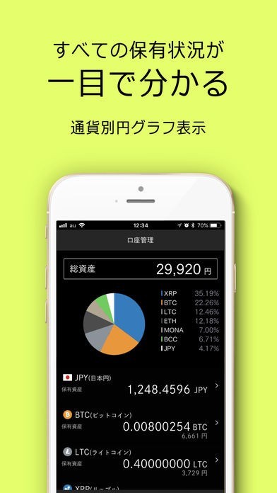 シンプルでスタイリッシュなデザインなので、初めての人でもプロでも簡単に操作ができます。資産は円グラフ表示なので資産の通貨別の内訳が一目でわかる仕組みになっています。