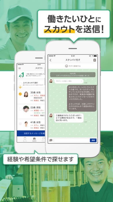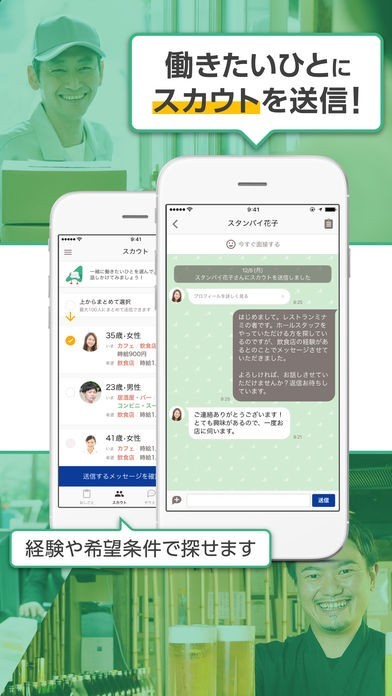 スタンバイアプリユーザーに対してスカウト機能でメッセージを送信することができるようになっていて、送信後はチャット機能でリアルタイムなやり取りをすることが可能です。