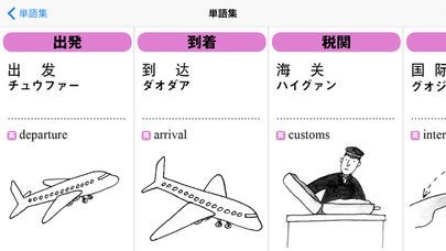 イラストも含まれる「単語帳」では、それぞれのシーンで使える単語を学ぶことができます。また、各単語はタップするだけでネイティブの発音を聞く事が出来るので、リスニング学習にも最適です。