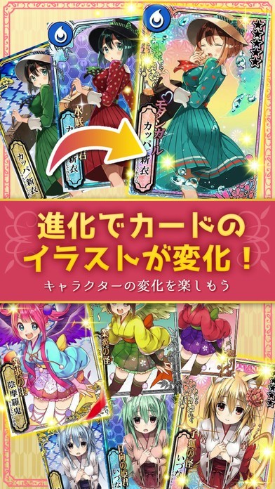 進化機能を搭載しています。お気に入りのカードを育成し、さらに強力なカードへと進化可能。進化を行うことで、カードに描かれたイラストもさらに美麗なイラストへと変わっていきます。