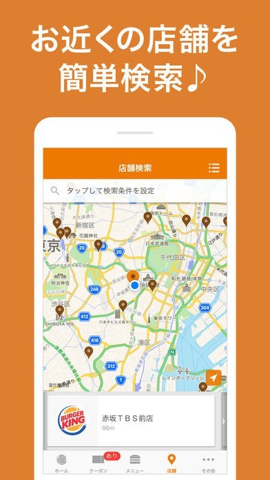クーポンを獲得する事が可能なので、バーガーキングの利用頻度が多い方やお得に利用したい時に重宝するでしょう。現在地周辺の店舗が素早くリサーチ出来るのもメリットですね。