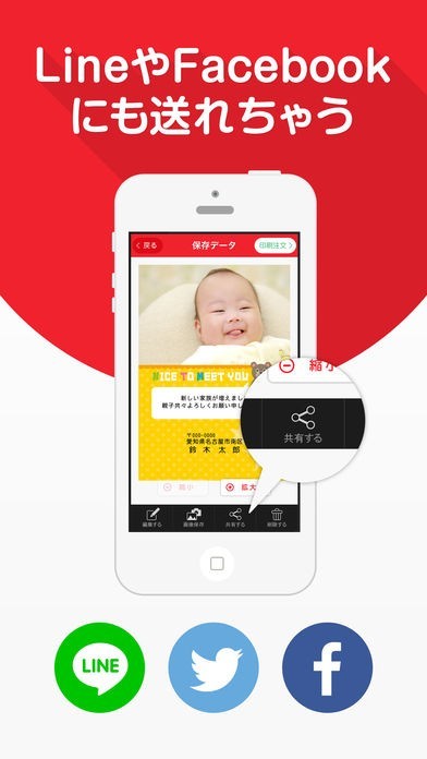 挨拶文や写真を選択していくだけ!完成した画像はSNSでシェア可能