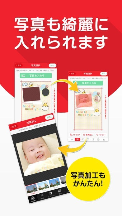 挨拶状のデザインには、結婚報告や出産など好きな写真を入れて利用