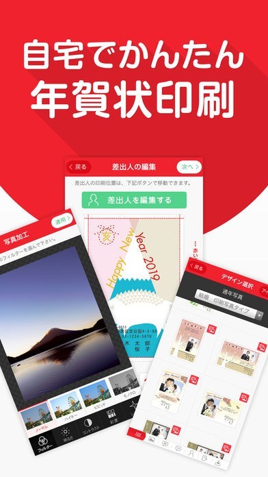 「自宅でカンタン挨拶状」は、アプリを利用するだけで簡単に年賀状や季節の挨拶状などが作成できます。まずは豊富なテンプレートの中からデザインを選択し、はがきに使用する写真を選びます。次に、あいさつ文と差出人を入力するだけと誰でも簡単に利用できます。印刷サービスが搭載されているので、完成したハガキはそのまま自宅のプリンターで印刷することも可能ですし、SNSでのシェア機能があるので、LINEやツイッターなどで心のこもったハガキの画像を友人に送信してもいいです。完成した画像は保存することが可能なので、各年の年賀状を思い出として保存しておくのもいいです。