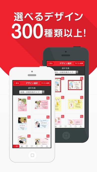 年賀状や冠婚葬祭など豊富な種類のデザインからイメージに合ったものを選択できる
