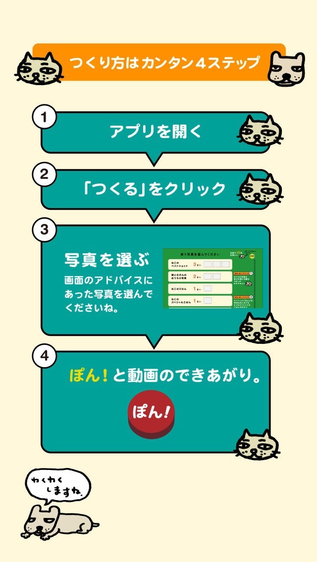 操作は簡単、とりためた大切なフォト画像を選んで「ぽん」ボタンを押すだけでねこくんのムービーが作成・保存できます。