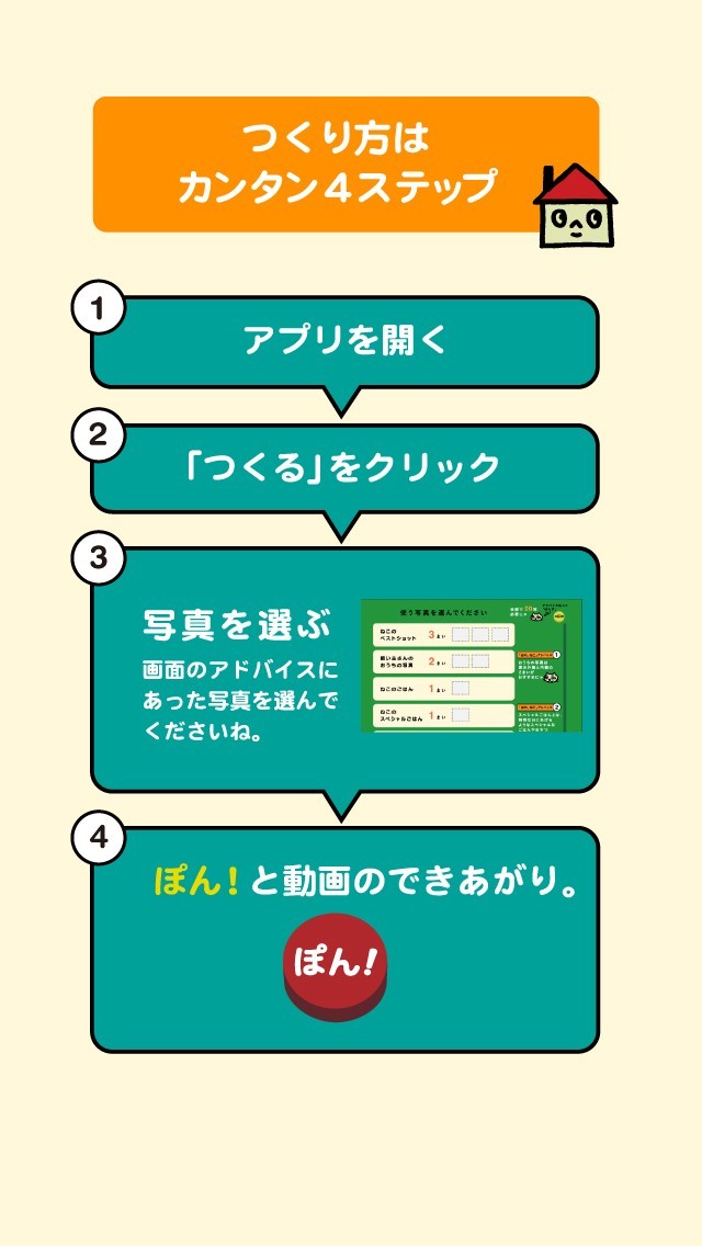 操作は簡単、とりためた大切なフォト画像を選んで「ぽん」ボタンを押すだけで家族のムービーが作成・保存できます。