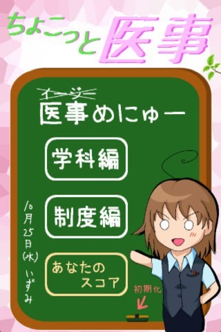 "ちょこっと医事"は、空き時間を利用して、お手軽な学習で医療事務の知識を深める事ができる学習アプリとなっています。出題は、"学科偏"と"制度編"、"あなたのスコア"の3つのメニューを収録しおり、各分野に沿った内容の問題が出題される仕様となっています。問題はマルバツの一問一答方式で行われ、解答欄に表示される、マル・バツを選択して解答をするだけと言うシンプルな操作性に仕上がっています。また、解答が正解か不正解か瞬時に結果が表示されます。さらに、スコア表示機能も搭載しており、自分の成績をグラフ化して知る事が可能になっています。時間や場所を選ばず、手軽に学習できる便利さがこのアプリの特徴と言えそうです。