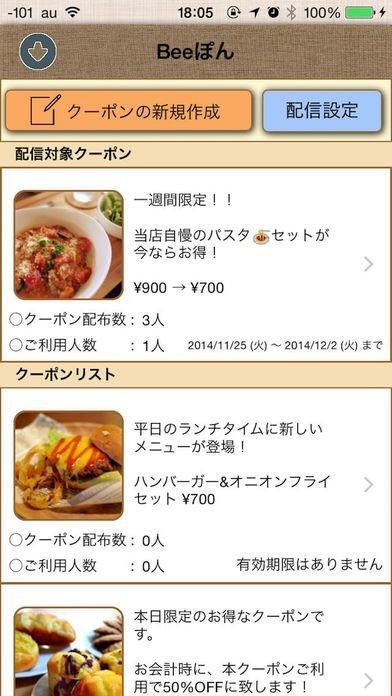 『お店でBeeぽん!!』は、あなたのお店のオリジナルクーポンを簡単に作成し、来店中のお客様に配布することができるアプリです。