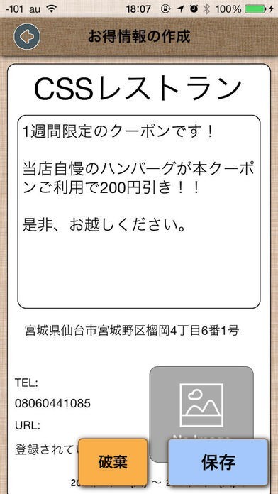クーポンには住所・電話番号・URLなどのお店情報を設定できます。