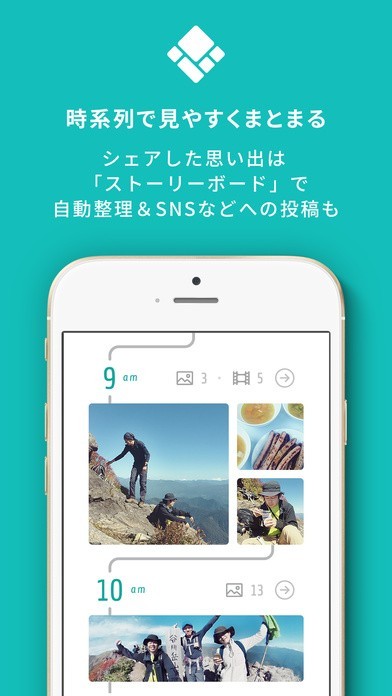 メンバーがそれぞれにアップロードした写真は、アプリ内のストーリーボードに自動で見やすい時系列でまとめられます。複数人の写真を撮影時間順で見られるので、思い出をしっかり振り返れます。