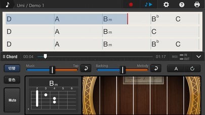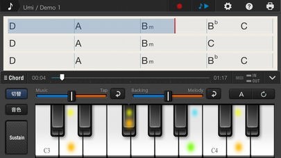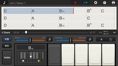スマートフォンに保存されている楽曲を選択すると、その曲の伴奏にぴったりなコード(和音)をアプリが解析し、再生に合わせて画面に表示してくれるので、すぐに演奏できます。
