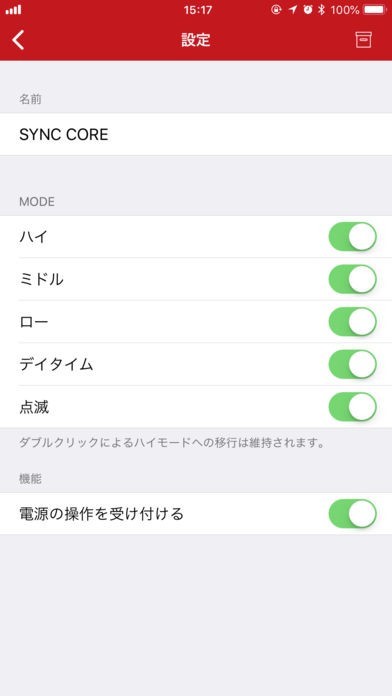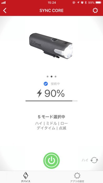 ライトを連携させる為の初期設定の他、それぞれのライトの設定やバッテリー残量の確認が可能になります。