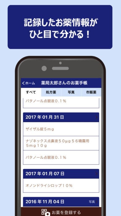 処方箋だけでなく市販薬の服用履歴も残すことができる。過去の服用履歴も見やすい
