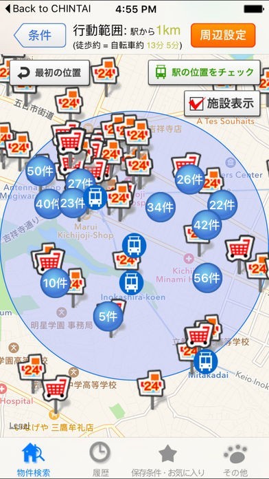 「CHINTAI」を使えば、「物件検索」によって、沿線、住所、地図、現在地という4つの方法から探し出すことができるので、お目当ての物件を発見できる可能性を高めてくれます。 加えて、検索条件によって「家賃」、「間取り」、「専有面積」などの条件を指定して検索することができるので無駄な物件を表示せずにすむので、選択肢を狭めることが可能です。 また、「周辺表示設定」によって、スーパー、コンビニなどから1キロ圏内にある物件などといった縛りでも調べることができるので、主婦の方が買い物をしやすい場所を見つけ出すことも簡単です。 それ以外にも、駅のアイコンをタップすれば、駅周辺のいろいろな情報をあらかじめ知れるので、住みやすい場所かどうかを事前に把握可能です。