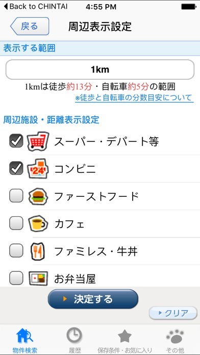 「CHINTAI」を使えば、「物件検索」によって、沿線、住所、地図、現在地という4つの方法から探し出すことができるので、特に電車通勤をするサラリーマンの方が毎日の通勤にかかる時間を把握するのに役立ちます。 加えて、検索条件によって「家賃」、「間取り」、「専有面積」などの条件を指定して検索することができるので条件に合わない物件を表示せずにすむので無駄な時間はかかりません。 また、駅のアイコンをタップすれば、駅周辺のいろいろな情報をあらかじめ知ることができるので、住みやすい場所かを把握できます。 それ以外にも、「周辺表示設定」によって、スーパー、コンビニなどから1キロ圏内にある物件などといった絞り込んで調べることができるので、通勤帰りに買い物をしやすい場所かどうかをチェックしておくことも可能です。