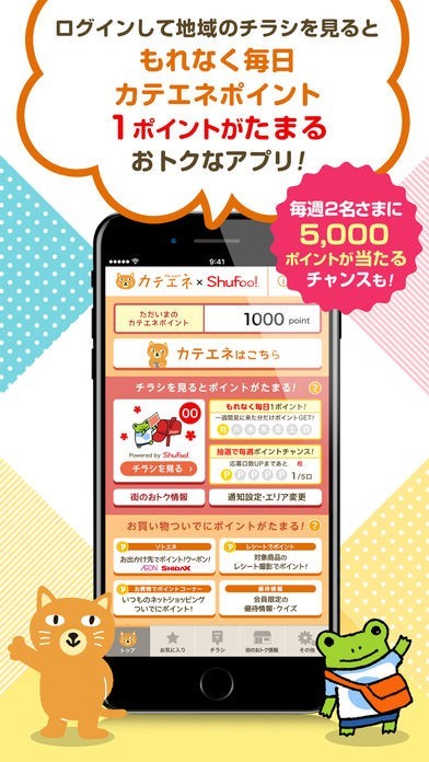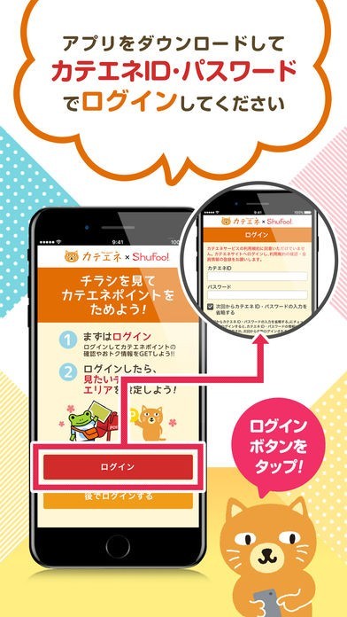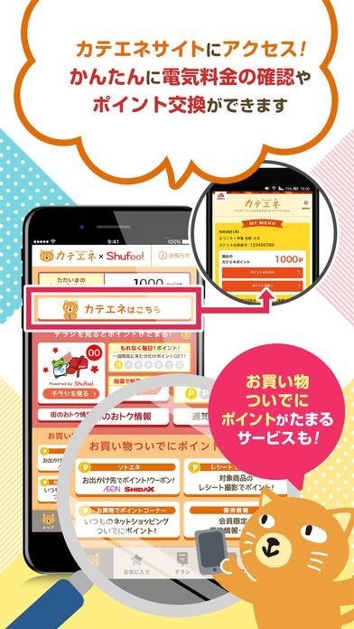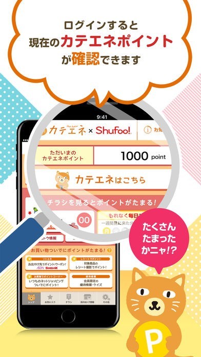 カテエネIDでログインすると、カテエネポイントの照会、チラシ閲覧で毎日もれなく1ポイント、毎週2名さまにカテエネ5,000ポイント、500名さまに50ポイントが当たるおトクなアプリです!