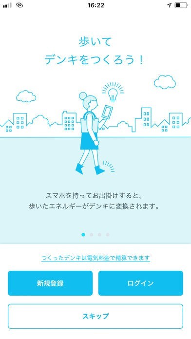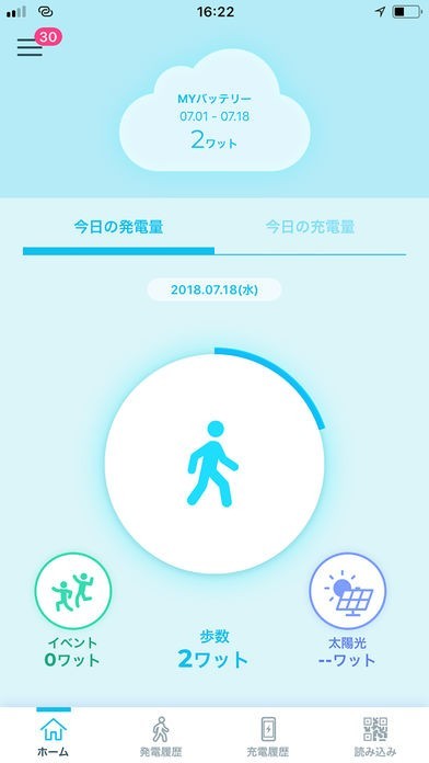 アプリを歩数計として使って1日の歩数を記録することができます。歩数に応じて発電量がワットで表示されるので、発電を疑似体験できます。アプリを使い始めてからの累計発電量も確認できます。