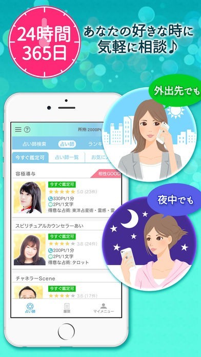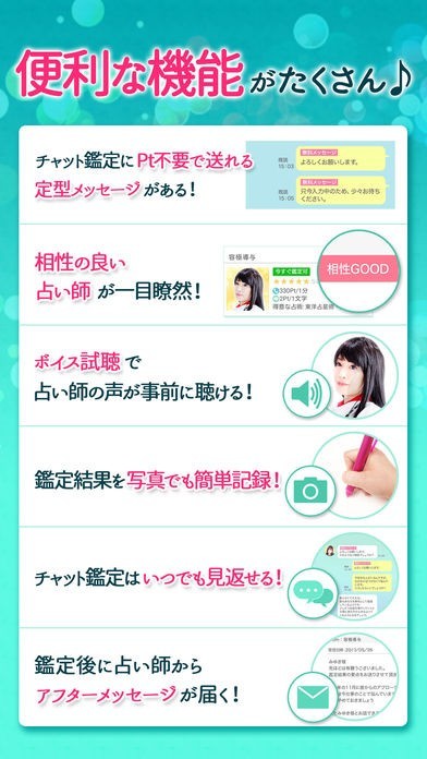 占い師の方への挨拶や相手への返信が無料で送れます。また、電話番号やメールアドレスも登録の必要が無く、好きな時に相談できる機能がついていることで。初心者でも安心して使えます。
