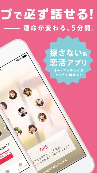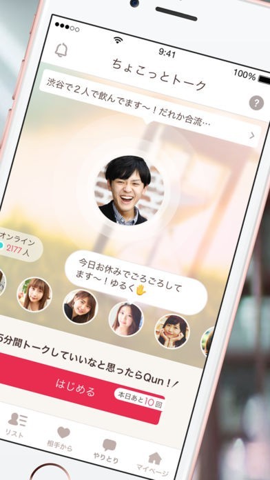 「Qunme」(キュンミー)は、20代の若いユーザーを中心に、必ず話せて、マッチングで相手を探すのがおっくうにならないという特徴で人気を集めている、マッチングアプリです。 ちょっとした空き時間に、5分だけの「ちょこっとトーク」を利用して気軽に出会いたい人同士での会話を楽しむことができるだけでなく、そのちょこっとトークで「いいな」と互いが思ったら「Qun(キュン)」というアクションをとることで、その後もやりとりができるようになります。