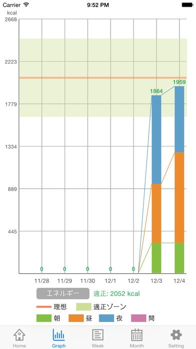 ・食事を朝食・昼食・夕食・間食毎に色分して比較しやすいグラフ。