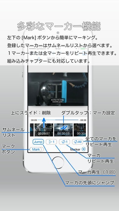 気になる場面や保存しておきたい場面があれば、すぐにマーカーを打つことが可能です。このマーカーを利用してリピートやランダム再生などができます。また、保存などの編集もマーカー単位で簡単に行えます。