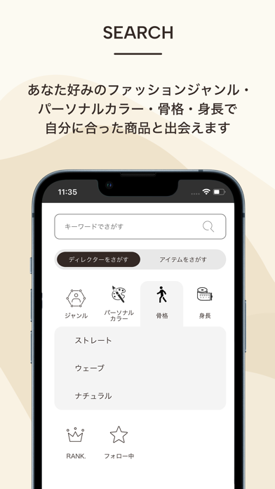 ファッションジャンル、パーソナルカラー、骨格、身長での検索が可能なため、