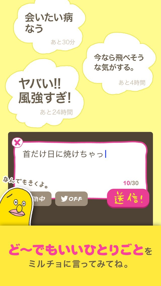 一言つぶやきでゆるキャラ育成!【きいてよ!ミルチョ】のスクリーンショット