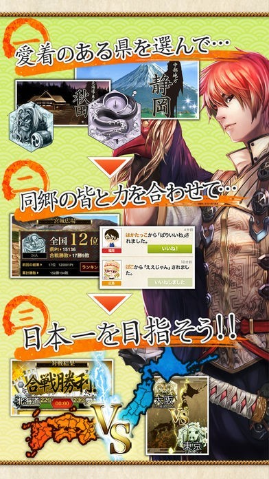 このゲームはオンライン要素も充実しています。10vs10の県対抗の合戦に勝利すれば、敵勢力を自分の県に取り込むことができます。同じ県出身の仲間を見つけて、日本一を目指しましょう。