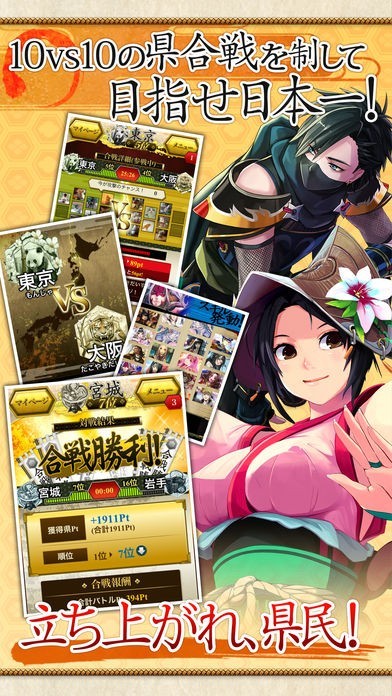 県合戦では10対10に分かれて日本一をかけて戦います。負けられない戦いで真剣勝負です。多数のキャラクターによるバトルシーンは迫力がありゲームの見どころでもあります。