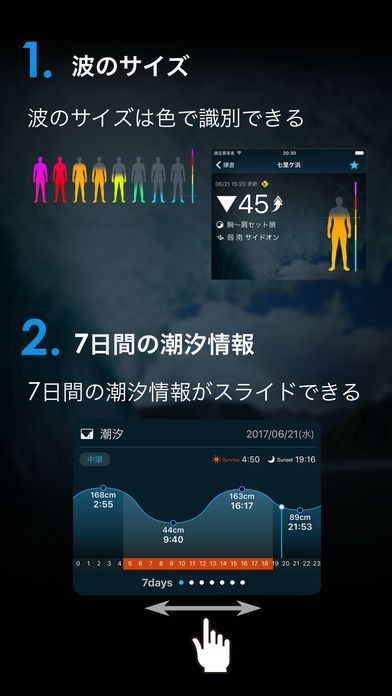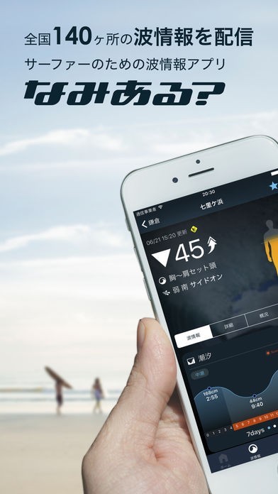 アプリ「なみある?アプリ サーフィン&波情報」では、全国で人気のあるサーフポイントの波情報をスマートフォンでいつでも確認することができます。24時間の波高や潮汐、風の強さなどといった、サーフィンに行くとき気になる情報がまとめてチェックできるので、仕事終わりや朝起きたときなど、ふと思い立ったタイミングですぐにどのサーフポイントにいつ行くかを決められます。また、波のサイズやコンディションは見やすいイラストとグラフで表示されているなど、使いやすいデザインも魅力です。