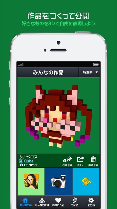 改造機能を搭載しています。他ユーザーが投稿した作品を加工し、新たな3Dドット絵を作成可能。友達同士でお互いの作品を改造したり、お揃いの改造をしてみたりと皆でワイワイ楽しめます。