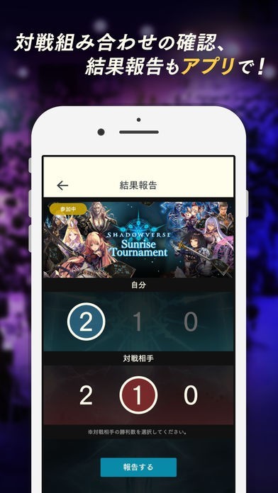 大会では対戦結果をアプリで報告することができます。勝利数を2・1・0から選んでタップするだけなので簡単です。報告した対戦結果はリアルタイムでにランキングに反映されます。
