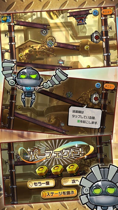 端末の傾きに反応してロボットが転がり、様々な仕掛けを解いて進もう!