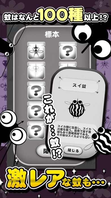 「蚊取フォーエバー」はひたすら蚊を叩き続けるストレス解消にもってこいのゲームです。画面をタップすると蚊を叩くのでうまく的の中心に蚊がやってきたタイミングを狙いましょう。タイミングよくたたき続けるのがランキング上位に食い込む秘訣です。たくさんの蚊を退治したり、1プレイの中で連続でたたいた蚊の数を伸ばすことで新しい種類の蚊をゲットすることができます。中には実際には存在しないような蚊も多数収録されているので面白いやりこみ要素です。すべての蚊をコンプリートするとなるとかなりのプレイ時間がかかってしまいます。仕事の合間などちょっとした休憩時間に少しずつプレイするのがおすすめです。
