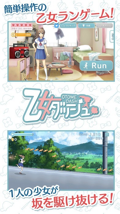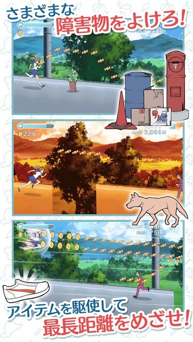 「乙女ダッシュ」は可愛い少女の主人公キャラクターをタップだけの簡単な操作で動かすことができるランアクションゲームアプリです。主人公の夏海が田舎町を舞台にして全力疾走していくのでポストや動物などさまざまな障害物をタップ操作で発動するジャンプで上手によけながら進んでいくゲームとなっていますが、距離を進めることでスピードアップしていくのでタイミングが重要になってきます。シューズなどのアイテムをゲットすることでスピードをアップさせたり、ジャンプ力を向上させたりすることが出来るので取り逃さないように集中しながら夏海を操ってあげる必要があります。