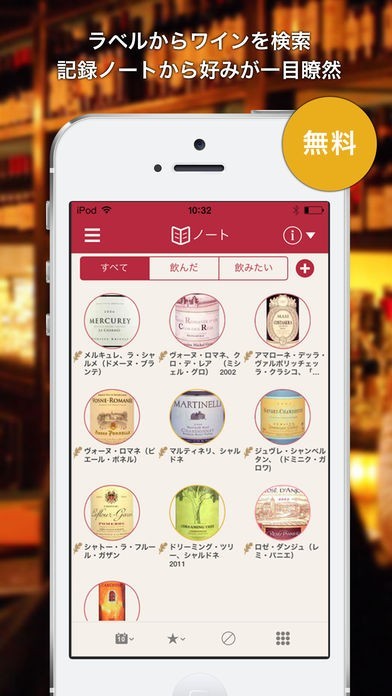 ・調べたワインを「飲んだ」「飲みたい」「味の評価」等でノートに登録することができます。
