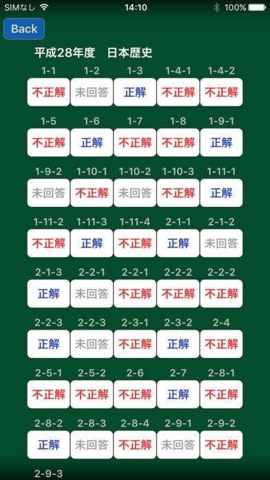 試験問題はクイズ形式と問題一覧の2つのタイプが用意されています。回答状態を一覧で確認することができるので自分の実力、進歩状況のチェックも可能です。正答率も表示されます。