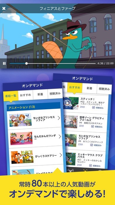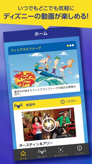 ・オンエアの視聴が可能。外出時や自分の部屋など、テレビの前にいなくても「ディズニー・チャンネル」の放送がリアルタイムで見られます。