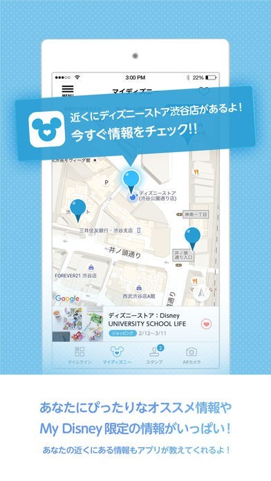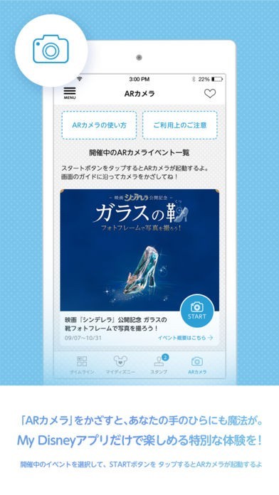 ストアやイベントなど気になる情報の見逃し防止には「My Disney(マイ ディズニー)」がおススメです。これまではそれぞれのサイトに情報が分散化していましたが、My Disney(マイ ディズニー)のアプリによって一元化が実現します。また、情報発信だけにとどまらず、カメラやアラームと連動する機能もファンには見逃せません。ARカメラは特定のマーカーにかざすとキャラクターが現れ、そこだけで撮影できるレア写真にもなります。イベントに合わせて予約できるアラームやスタンプ帳も収録しているMy Disney(マイ ディズニー)は、ファンにはたまらない機能が盛りだくさんです。
