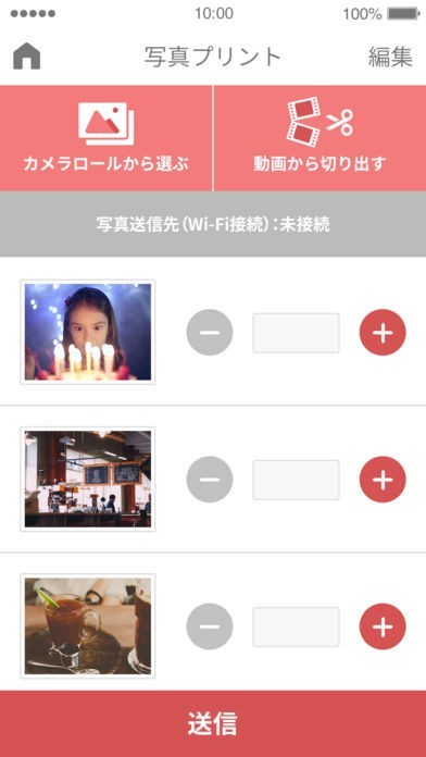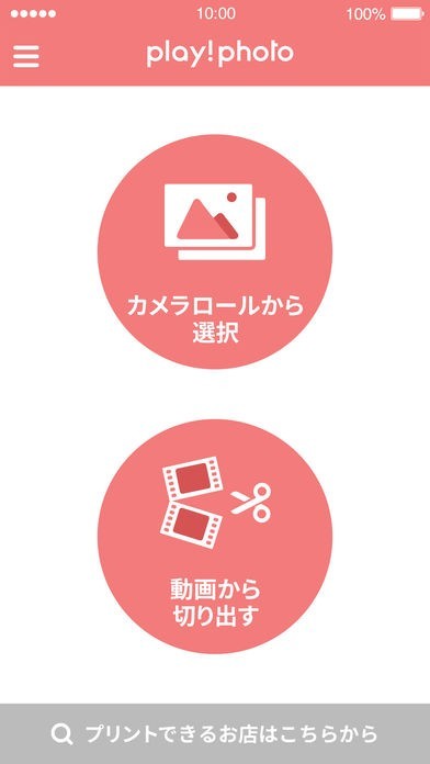 スマホの写真をWi-Fiでセルフプリント機に送信することができるアプリです。スマホに保存されている写真を選んで、プリント機に表示されるパスワードを入力すると送信できてプリントが始まります。 写真だけでなく動画から好きなシーンを切り取ってプリントすることも可能です。範囲を指定すれば自動で30カット表示されるので選ぶのも簡単です。はさみマークをプリントしたいカットの上まで動かしてタップすると選択できます。 プリント可能な店舗はトップ画面から確認できます。