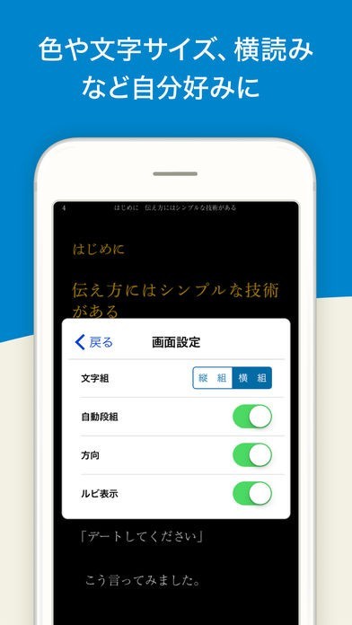 縦読み、横読みを選べるのが地味に便利。文字を大きくしたり、色を変えることができたり、目にも優しい。