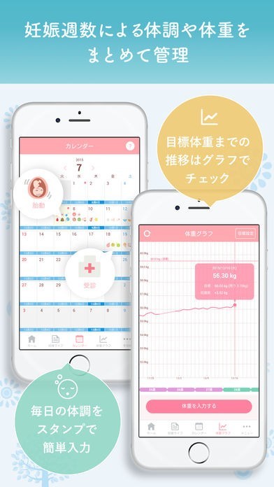 ママの体調を簡単に管理できる“体調スタンプ”や、健診スケジュールや日々の予定を妊娠週数と一緒に管理できるカレンダーがあるので便利です。