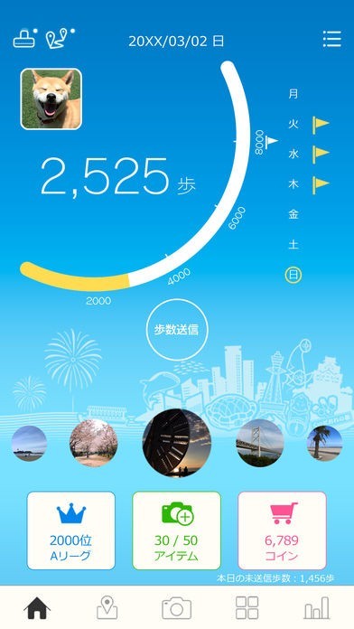 ホーム画面の送信ボタンをタップすると、歩数データが送信されます。
