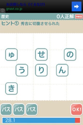 App Storeより引用バラバラになった名前をヒントをもとに並び替えるゲームです。