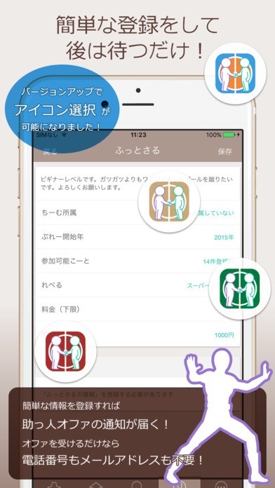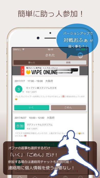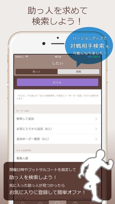 フットサルのメンバーが急遽参加することができなくなってしまったときなどに、メンバーの助っ人を探すことができるようになっているアプリで、助っ人としてプレイしたい人をスムーズに見つけることができます。